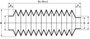 Aşağıdaki iki ucu aynı çapta olan kauçuk lastik körüklerin (rubber bellow) iç bağlantı çapları, azami (maksimum) açılım, kapanım ve serbest duruşlarının boylarının ölçüleri milimetre(mm) cinsinden listelenmiştir. Ölçülere kelepçe bağlantı yerleri dahil edilmemiştir.
